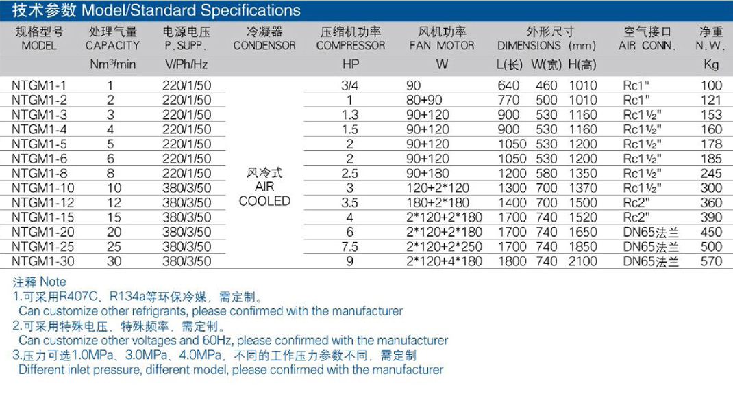 Refrigeration air dryer is specially designed for hot filling beverage PET bottle blowing, it contains two filters and two stage refrigerating system inside, with low outlet temperature is